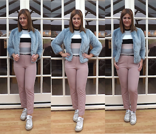 Well, you know I love a good pun. And I also love stripes, particularly because they're so versatile. I mean, I don't often do casual but for the occasional Saturday where I'm running errands (like returning online orders and going for a sunbed), this kind of outfit is perfect. I have this striped top in two different colour schemes; one with more beige and khaki and then this one with more blues and cool tones, which matches perfectly with these blush pink trousers. I kept it matchy matchy with powder blue faux fur coat and then finished the outfit with, wait for it... flat shoes!