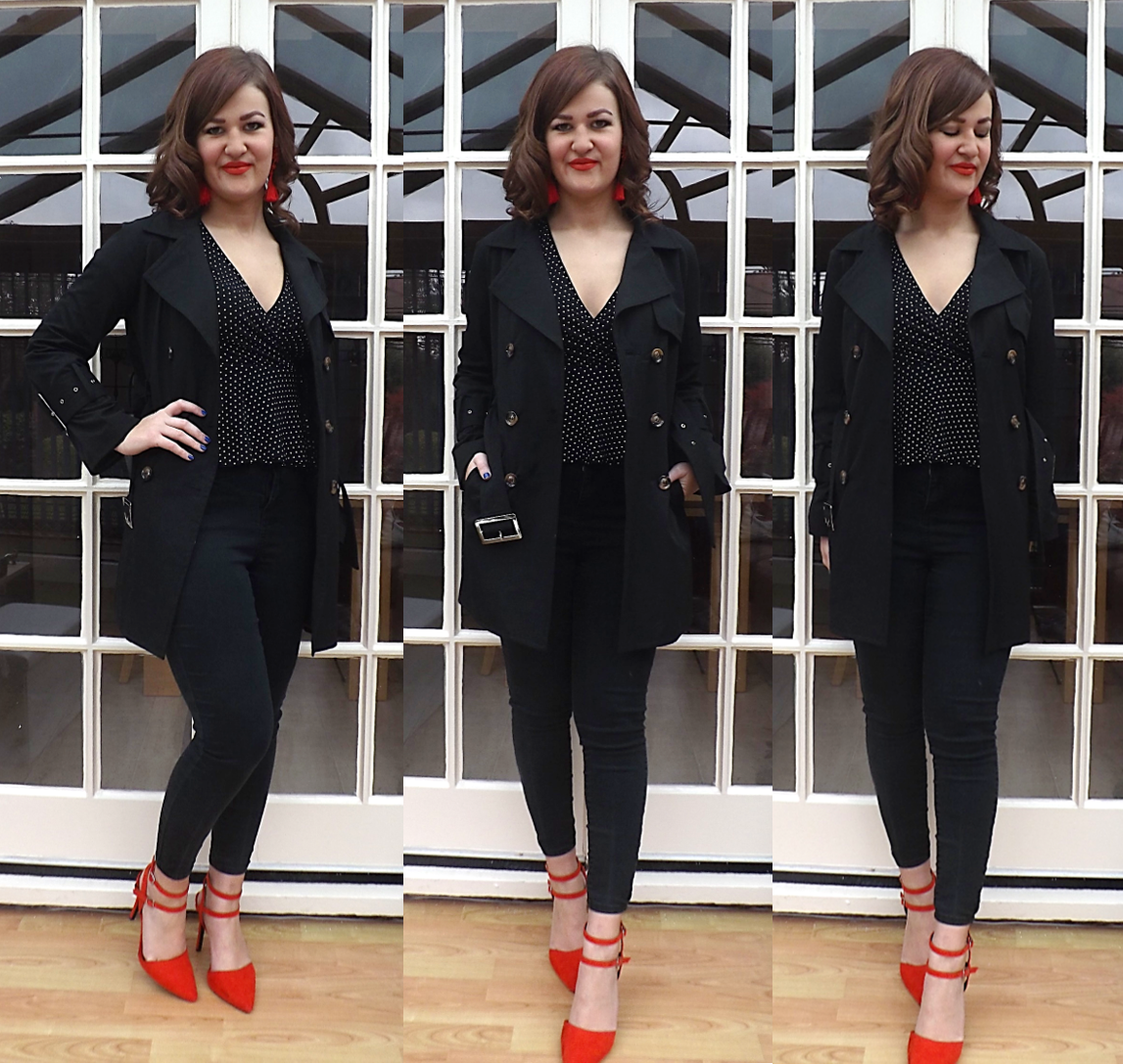 It's one thing building your outfit from the shoes up but this time I went one step further and built it from the earrings down. I am obsessed with these orange-red curtain tassel earrings (an ebay bargain) and they match these heels perfectly. After adding Malice liquid lipstick by Kat Von D, I figured I already had enough colour for one day so I kept the rest all black errthang. Black jeans, black spotty wrap top and black mac.